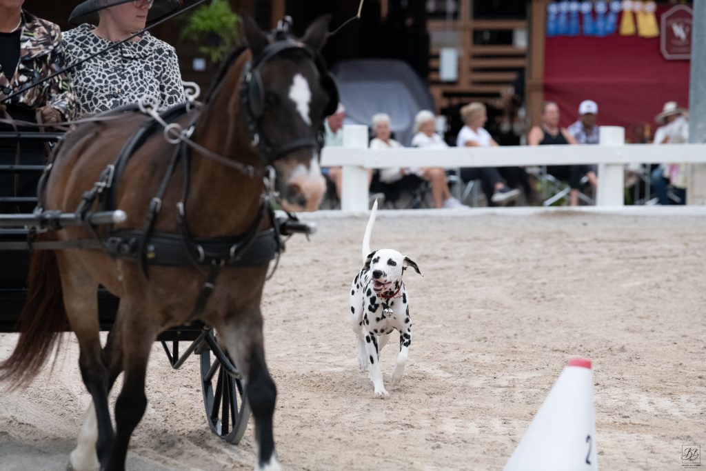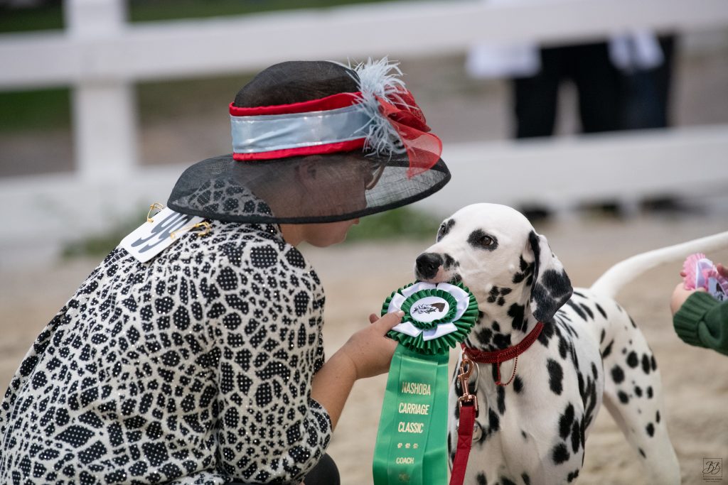 The Coach Dog Class pays tribute to the centuries-old tradition of dogs working alongside carriages. This class was held for the first time at the 2023 Nashoba Carriage Classic and was an instant crowd favorite. Watching dogs of various backgrounds and breeds work alongside the carriages is a real delight for our spectators! The concentration and technical skill required of the dogs and their handlers are impressive. All breeds are welcome, and the specifications of the class are provided in detail below. Please tap the link to download our Coach Dog Class Rules & Procedures.